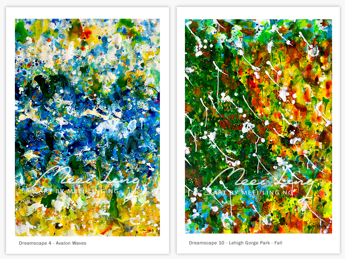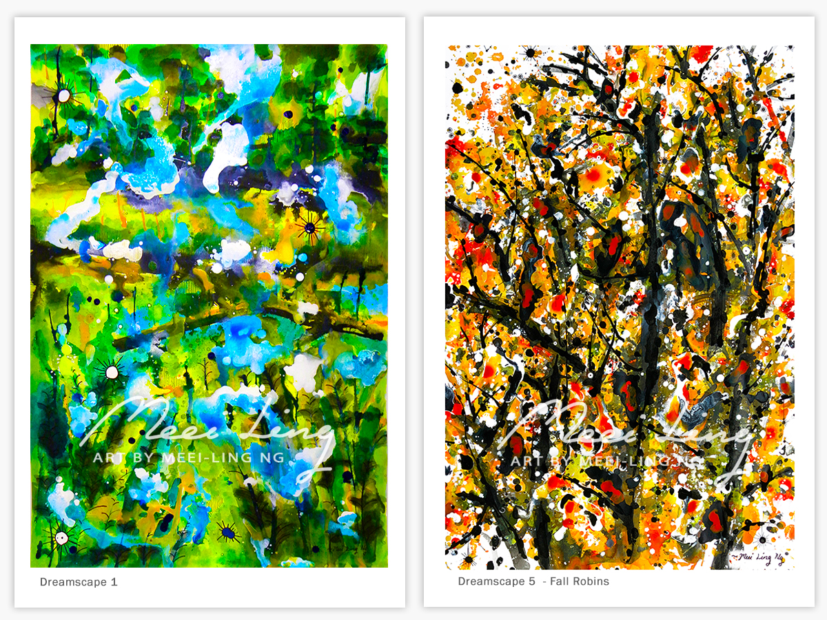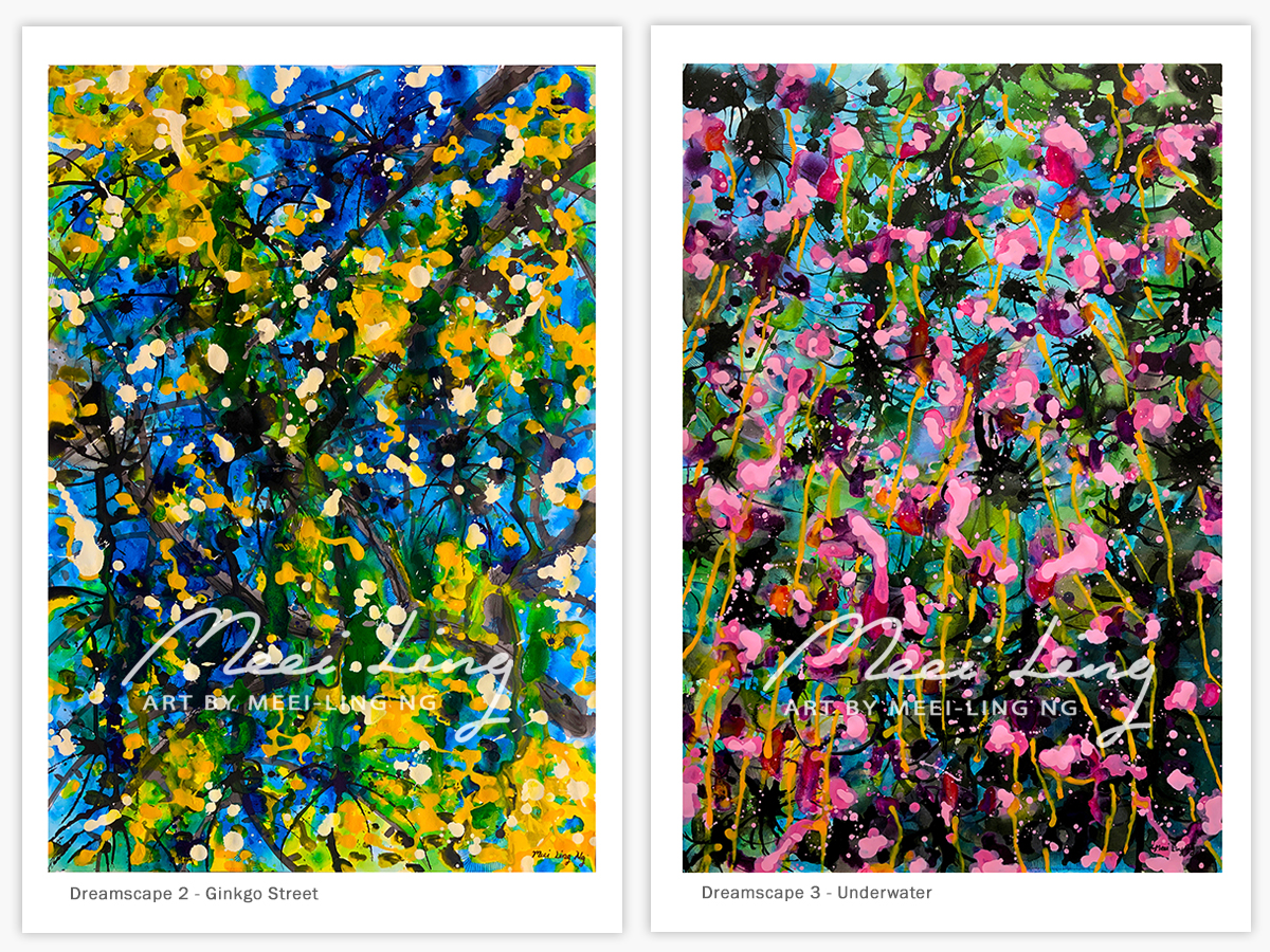 In Dreamscapes, I expressed the emotion of the places or scenery through my use of colors, inks, water and brush strokes on paper. Combined with the washing of water color effect and drips and splashes method upon layers after layers to create the overall dreamscapes. I get a feeling of satisfaction, especially with the drips and splashes that give me the freedom to express the emotion in the look of the scene. It wasn’t easy to achieve what i want at the beginning using this medium but through many experiments and mistakes, I learned and achieved the desired result. The final touches at the end of the process are the most fun part of creating this series which is adding in small simple drawings in the zoom-in world of each piece. I usually have no idea what I am going to add in but drawing on the spot for what comes out from my mind makes it original and satisfying. I enjoyed every second of it while creating this series. My paintings have so many textures and forms in them, best to see them in-person and up close. Typically, photos won’t be able to show the depth.