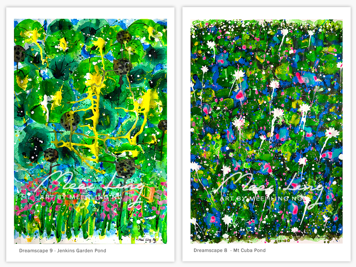 I have visited Mt Cuba and Jenkins Arboretum/Garden recently. Both parks focus on planting a lot of native trees and plants, all beautiful and with their own charms. Both arboretums have beautiful ponds filled with lotus plants and flowers that attracted a lot of pollinators and insects. I noticed that even though they both places have similar designs and purpose, they are very different in terms of atmosphere and surrounding environment. I wanted to capture the different feelings of each setting. One seems more peaceful and calm, the other seems more playful.