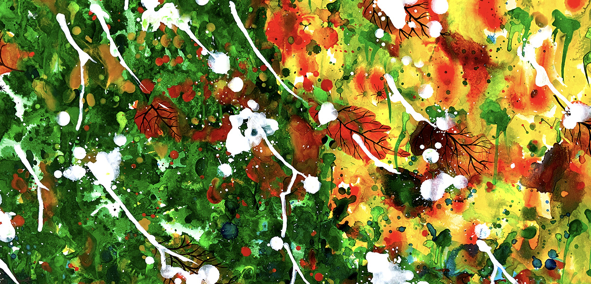 My first piece in this series. Inspired by a visit to Brandywine Creek State Park. I wanted to capture the beautiful creek with lot of greenery and insects. Splashing a lot of white and blue paints to create the dreamy like water effect.